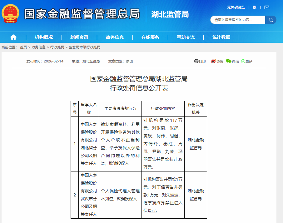 編制虛假資料、欺騙投保人等,中國人壽湖北分公司被罰款117萬元
